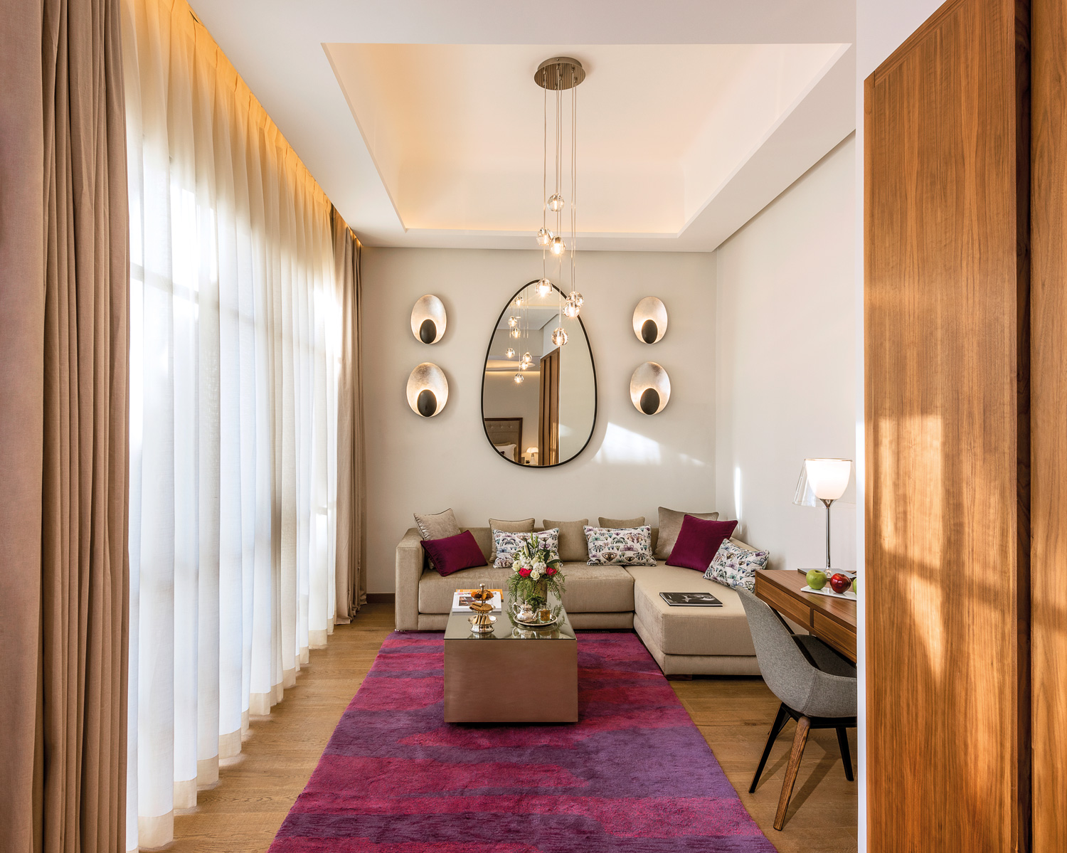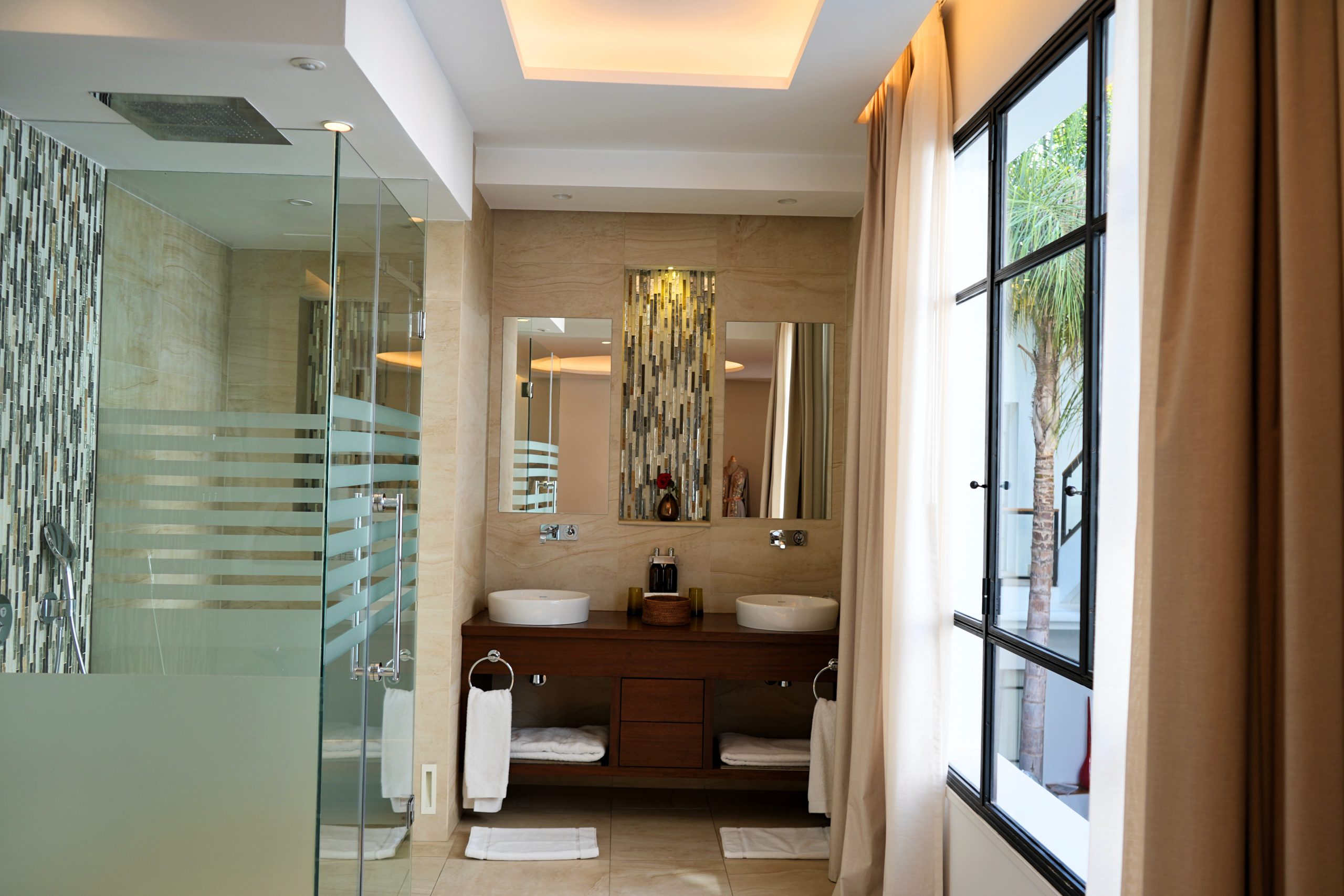 These spacious suites come with a separate seating area, Twin beds – may be joined into king size, slippers, bathrobes, a partially open bathroom featuring a deep soaking bathtub, double sinks, separate toilet and rainfall shower head.